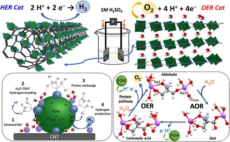 研究團(tuán)隊(duì)將一種釩簇與碳納米管結(jié)合,形成混合材料。團(tuán)隊(duì)負(fù)責(zé)人瑪麗亞·希門(mén)尼斯-洛佩茲指出:“關(guān)鍵不在于金屬簇本身,而在于其周?chē)袡C(jī)陽(yáng)離子的排列方式。” 當(dāng)材料與納米管物理混合時(shí),被稱(chēng)為T(mén)RIS的陽(yáng)離子被鎖定在晶體結(jié)構(gòu)中,促使反應(yīng)通過(guò)特定氧化機(jī)制產(chǎn)生氧氣。而當(dāng)材料以定向方式組裝時(shí),同樣的陽(yáng)離子被釋放并朝向表面,起到捕獲質(zhì)子的作用,從而使系統(tǒng)轉(zhuǎn)變?yōu)楦咝У漠a(chǎn)氫催化劑。