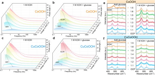 研究人員首先比較了多種地殼豐度較高的金屬氧羥化物,確定CoOOH是葡萄糖氧化的理想起點(diǎn)。隨后,他們系統(tǒng)性地引入不同摻雜元素,發(fā)現(xiàn)僅添加5mol%的銅即可顯著提升CoOOH的選擇性與電催化效率。經(jīng)銅摻雜后,甲酸鹽的生成率由50%提高至80%,葡萄糖氧化的起始電位降低約400mV,使得在堿性條件下實(shí)現(xiàn)高度節(jié)能的共電解成為可能。