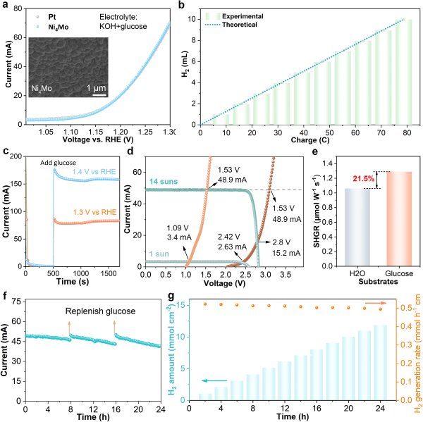 當(dāng)該陽(yáng)極體系與地殼豐度較高的Ni4Mo陰極耦合時(shí),在無(wú)隔膜電池中可實(shí)現(xiàn)近100%法拉第效率的純氫生成。在聚光太陽(yáng)照射下,裝置的制氫速率達(dá)到519.5±0.4μmol·h-1·cm-2,并在連續(xù)24小時(shí)運(yùn)行中保持穩(wěn)定性能。