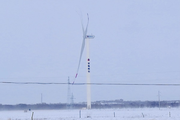▲吉電股份華北區(qū)域公司張北縣“互聯(lián)網(wǎng)+智慧能源”示范項(xiàng)目的風(fēng)機(jī)如“鋼鐵衛(wèi)士”一般傲然屹立在風(fēng)雪中。