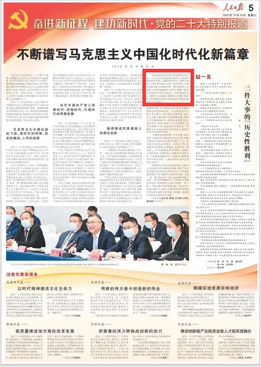 10月19日,《人民日?qǐng)?bào)》“奮進(jìn)新征程 建功新時(shí)代·黨的二十大特別報(bào)道”專(zhuān)版頭條刊發(fā)《不斷譜寫(xiě)馬克思主義中國(guó)化時(shí)代化新篇章》。報(bào)道中,國(guó)家電力投資集團(tuán)有限公司黨組成員、副總經(jīng)理盧洪早代表表示:“抓創(chuàng)新就是抓發(fā)展,謀創(chuàng)新就是謀未來(lái)。只有以科學(xué)的態(tài)度對(duì)待科學(xué)、以真理的精神追求真理,以滿(mǎn)腔熱忱對(duì)待一切新生事物,才能不斷拓展認(rèn)識(shí)的廣度和深度,不斷實(shí)現(xiàn)新突破、取得新成果。我們將堅(jiān)持守正創(chuàng)新,以國(guó)家戰(zhàn)略需求為導(dǎo)向,集聚力量進(jìn)行原創(chuàng)性引領(lǐng)性科技攻關(guān),為保障能源安全、增強(qiáng)自主創(chuàng)新能力提供有力支撐。”以下為報(bào)道全文: