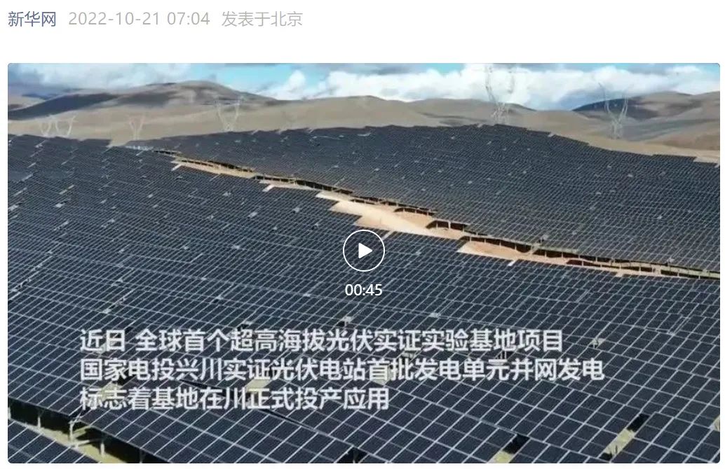 10月21日,新華網(wǎng)官方微信號刊發(fā)《全球首個(gè),正式投產(chǎn)!》一文,3小時(shí)閱讀量10萬+。報(bào)道稱,超高海拔光伏實(shí)證實(shí)驗(yàn)基地項(xiàng)目——國家電投興川實(shí)證光伏電站首批發(fā)電單元并網(wǎng)發(fā)電,標(biāo)志著四川甘孜州興川光伏實(shí)證實(shí)驗(yàn)基地正式投產(chǎn)應(yīng)用。電站投運(yùn)后將填補(bǔ)我國光伏實(shí)證基地在超高海拔、中緯度地區(qū)的空白,為川藏高原以及全國范圍內(nèi)相似場景地區(qū)的光伏建設(shè)提供參考。以下為報(bào)道全文: